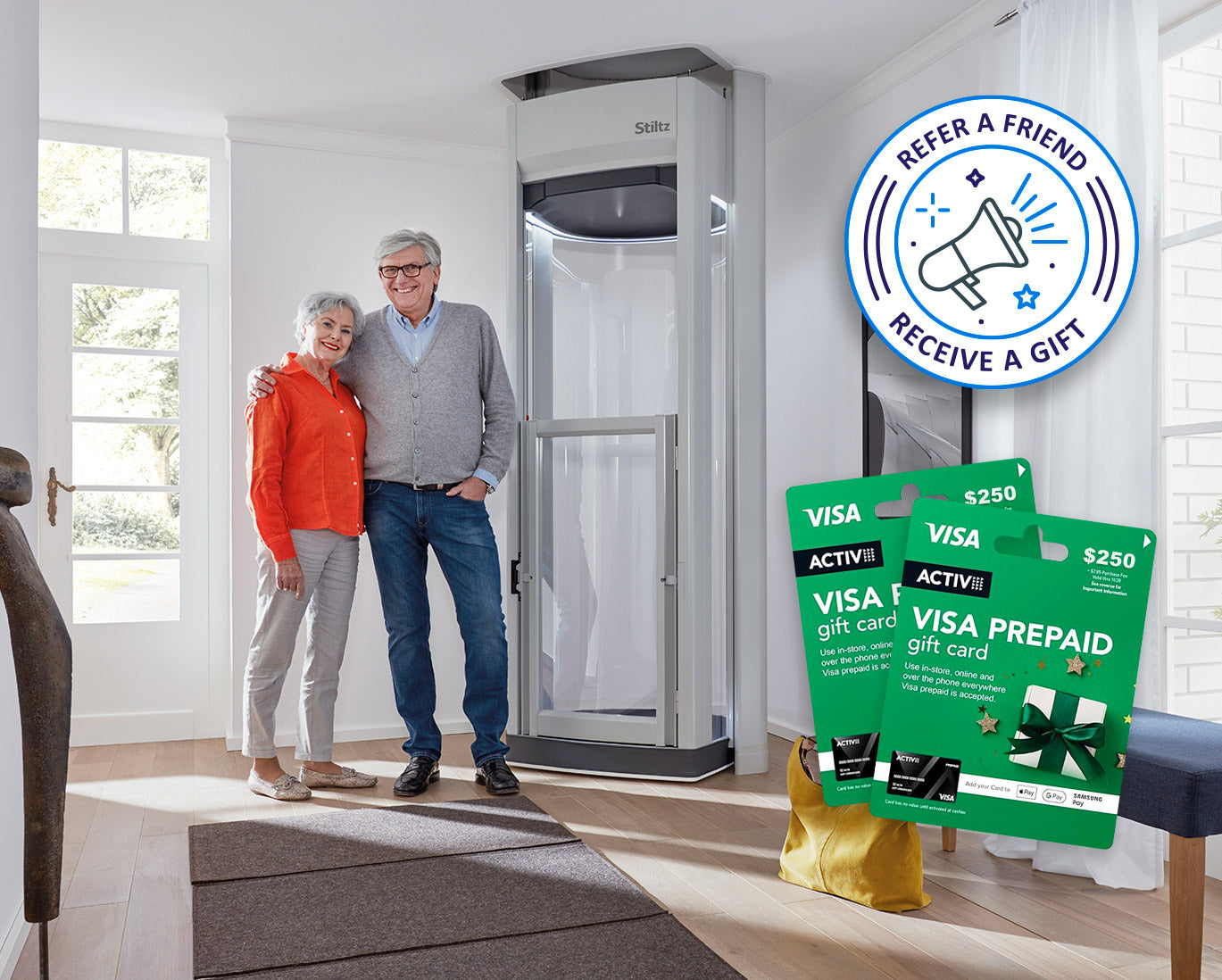 The $250 Visa Gift Card for both the referrer and referee will be issued once the referee’s lift installation has been completed and handover has been confirmed. Gift cards will be sent via registered post to the addresses provided. Compact Home Lifts is not responsible for lost, stolen, or misdelivered cards once delivery has been confirmed by Australia Post.